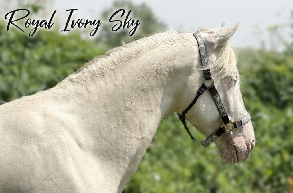 Our young Cremello Stallion, ROYAL IVORY SKY a.k.a. Orion. D.O.B. June 17, 2020. He is from old walking horse lines which means he will be a solid 15+ hands when he gets through growing. Reg #22001396/CR. He has a wonderful natural gait. Now standing at stud.